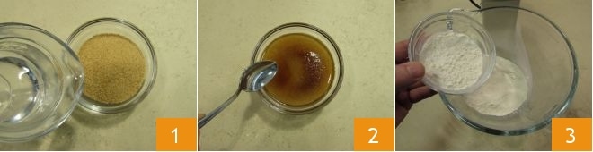 To prepare the vegan tartlets, first make the vegan butter. Then take care of the dough: place the brown sugar in a small bowl with the water 1, stir with a teaspoon to dissolve it 2. Then add the flour 3 to the bowl of a stand mixer fitted with a paddle attachment.