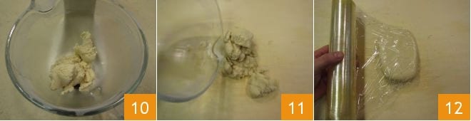 Work the mixture again until you obtain a homogeneous dough 10. Then transfer the dough to a slightly floured work surface 11 and form a loaf; wrap it in plastic wrap 12 and let it rest in the refrigerator for at least 1 hour.