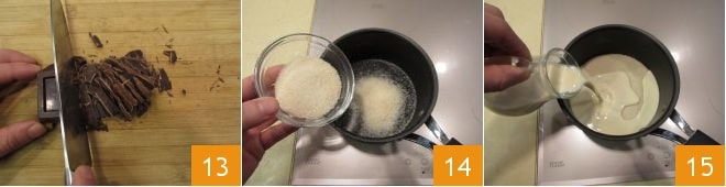 In the meantime, prepare the cream. First, chop the dark chocolate and set it aside in a small bowl 13. Then pour the sugar 14 and the soy milk 15 into a saucepan.