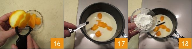 Then take the zest of half an orange using a peeler and without taking the white part 16. Add it to the saucepan along with the seeds you extracted from the vanilla bean and the emptied pod 17. Then pour in the cornstarch 18