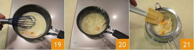 and mix with a whisk 19 until the cream thickens 20. As soon as it starts to boil, remove it from the heat, and strain it with a spatula 21.