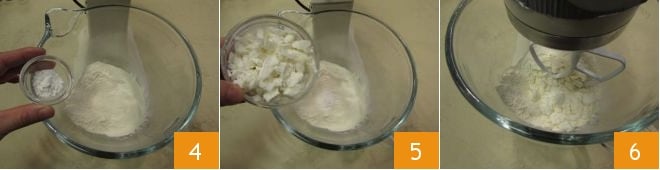 the baking powder 4 and the vegan butter cut into cubes 5. Mix the ingredients for a few seconds 6,