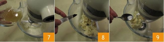 then add the sugar dissolved in the water 7. Add the vanilla bean seeds 8 and the salt 9.