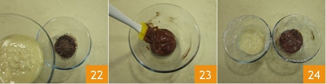 At this point, while it is still very hot, transfer half of it (about 165 g) to the bowl with the chocolate 22 and mix with a spatula until the chocolate is completely melted 23. If during straining the cream has cooled down, heat it in the microwave for a few seconds. Cover both creams with plastic wrap 24 and let them cool in the refrigerator.