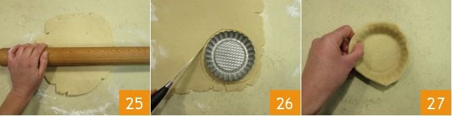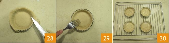 Then remove the excess dough from the edges with a small knife 28 and prick the base with a fork 29. Repeat this operation for the other tartlets 30 and bake them in a fan oven at 340°F (170°C) for 15-20 minutes until they are golden brown.