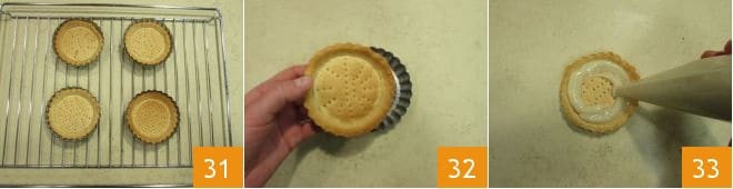 Then remove them from the oven 31 and let them cool for about ten minutes before turning them out 32. Transfer the two creams into two piping bags and fill the first 4 tartlets with the plain cream 33.