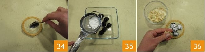 Smooth the surface with a teaspoon 34. Then place some blackberries in a small bowl and sprinkle them with powdered sugar 35, then place them on your tartlets and decorate with almond flakes 36.