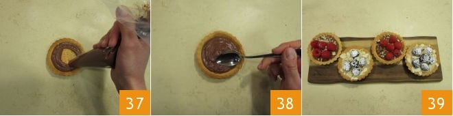 Fill the other 4 tartlets with chocolate cream 37, smooth the surface 38, and decorate with raspberries and chopped nuts. The vegan tartlets are ready to be served 39!