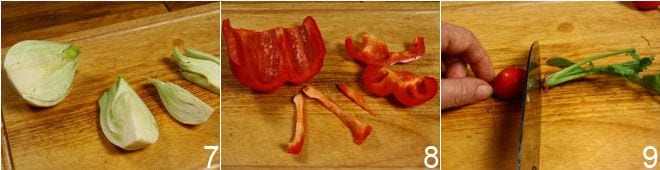 Take the half bell peppers, remove the filaments and the white internal parts, trim the ends to make them regular, 8 then cut the peppers into strips. Remove the radish leaves by cutting them at the base 9 and wash them under running water.