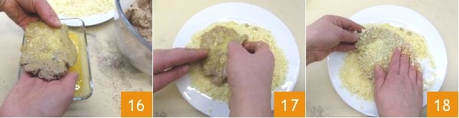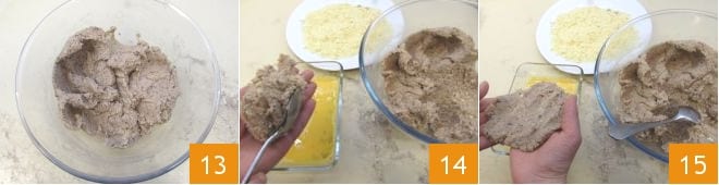 Mix carefully 13, it should be a compact, non-sticky dough. Now prepare the breading: set up a shallow, wide bowl with beaten eggs and a plate with breadcrumbs. Take a spoonful of the bean mixture equivalent to about 5 oz 14 and flatten it in the palm of your hand until it forms a flat, slightly irregular cutlet shape 15.