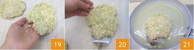 Once breading is completed, gently place the cutlet on a tray covered with parchment paper 19, and continue with the others. Heat the oil in a shallow, wide pan. Retrieve the cutlet with a spatula 20 and when the oil reaches 340°F, immerse the cutlet to fry 21.
