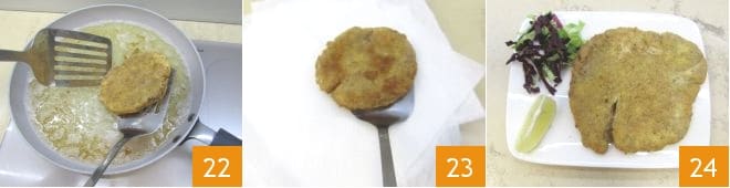 As soon as it is well golden, turn it to the other side using 2 spatulas 22. Brown this side as well, then drain the cutlet and let it dry on a paper towel to absorb the excess oil 23. Continue with the other vegetarian cutlets and serve them hot with a wedge of lemon as tradition dictates!