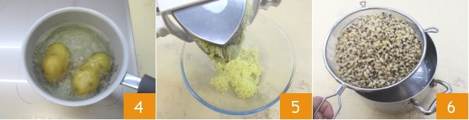 In the meantime, bring a pot of cold water to a boil with the whole, well-washed potatoes and cook them for about 25-30 minutes from boiling point 4. In the end, when pierced with a fork, they should be soft. Drain them and let them cool enough to handle, then mash them with a potato masher and gather the resulting puree in a bowl 5 (alternatively, you can peel them and pass them through a food mill or mash them with a fork). Return to the beans: when they are almost cooked, salt them. Finish cooking, drain them, and let them rest in a sieve to lose any excess water 6.