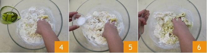 Add the oil 4 and finally the salt 5 and continue to mix the ingredients until they are compacted 6.