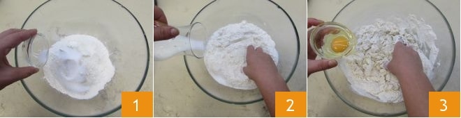 To prepare the vegetarian danube, start with the dough. In a bowl, pour the flour (use Manitoba or all-purpose flour) along with the sugar and dried yeast 1. While kneading, slowly add the lukewarm milk 2 and then the egg 3.