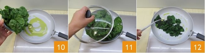 In the meantime, prepare the fillings. In a pan, pour some oil along with the garlic and when it's hot, add the spinach 10, cover with a lid 11, and cook over high heat for a few minutes, just enough to wilt the leaves. When the spinach is softened, adjust with salt, remove the garlic 12
