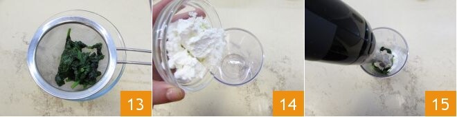 and then let them cool and drain any excess liquid by placing them in a container with a sieve 13. Next, pour the ricotta into the bowl of an immersion mixer 14, add the spinach, and blend 15