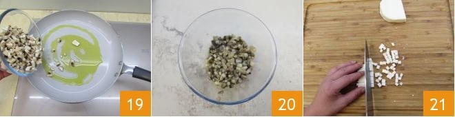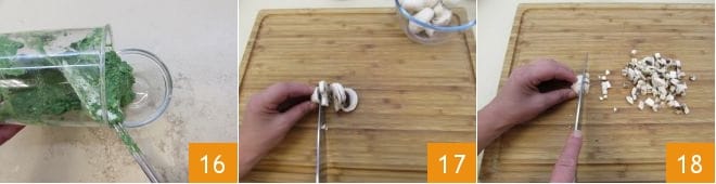 until you obtain a smooth and homogeneous cream that you can transfer to a container and set aside 16. Move on to the mushrooms, after rinsing them quickly under water, remove the lower part and slice them 17 before chopping them into cubes 18.
