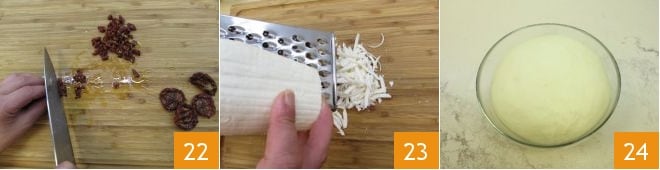 and grate the salted ricotta 23 and take the danube dough, which should now be well risen and doubled in volume 24.