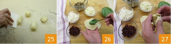 Divide the dough into 27 small spheres 25, flatten them with your fingers or a rolling pin, and start adding the 3 fillings in the center, alternating them. So, in the center of a disc, add a bit of the spinach blended with ricotta 26 and close by pinching the edges with your fingers, ensuring there are no open spaces from which the filling might leak 27