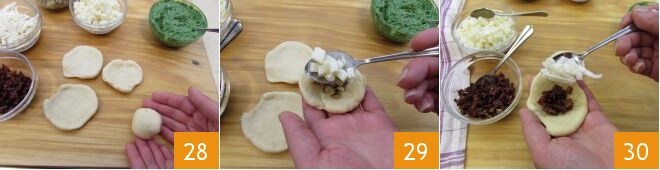 and finally round them until forming a ball 28. Repeat the same process with the other ingredients, with mushrooms and cubed cheese 29 and then with sundried tomatoes and grated ricotta 30