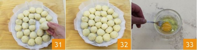 Line a round baking tray with parchment paper with a diameter of 12.6 inches and place the filled balls one by one 31, alternating the various flavors. It is important that the closure of the sphere faces downwards, this way the balls will not open during baking. Cover the danube with plastic wrap and let it rise at room temperature for about an hour 32. When it is puffed up again, crack an egg and beat it lightly with a fork 33.