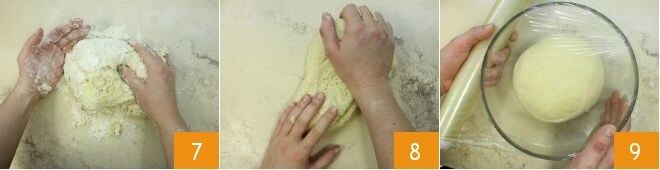 At this point, transfer the dough to a work surface and knead it by hand 7: stretch the dough and then roll it back up and continue like this for about ten minutes 8, this way you will incorporate air and warm the dough. Finally, form a sphere and place it in a container, covering it with plastic wrap, and let it rise for 3-4 hours in the oven with the light on 9.