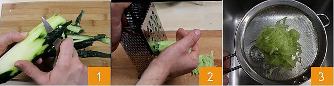 To prepare the veggie wraps, start by making the tzatziki sauce: wash the cucumber and with a small knife remove the peel until you obtain a completely white surface 1. Grate the cucumber with a coarse grater 2, then transfer the pulp to a sieve, squeezing it well to drain the vegetation liquid 3.