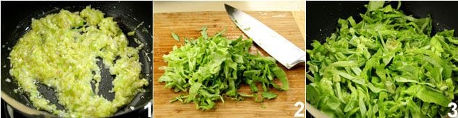To prepare the lettuce velouté, clean and chop the shallot and scallions, including the tender green part. In a large pot, melt the oil and butter, then add the shallot and scallions and let them soften 1 over low heat for 10-15 minutes without browning. Meanwhile, detach the lettuce leaves from the heads, discarding the more damaged outer leaves, and wash them thoroughly with cold water to remove any traces of soil. Cut the lettuce leaves into chiffonade 2 (to see the video on chiffonade cutting click here) and add them to the scallions in the pot 3.