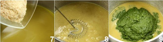 Add 1 oz of breadcrumbs to the cooking liquid 7, gently cook the mixture, stirring with a ladle until it thickens 8. Then pour it into a pot, filter it to avoid any lumps, add the lettuce cream 9, and mix everything together. Depending on the desired thickness, add more hot vegetable broth.