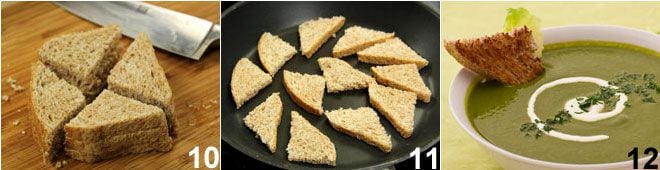 Cut the bread into triangles 10 (sliced bread will also work) and toast it 11 without any fat in a well-heated non-stick pan on both sides. Pour the velouté into the dishes, garnish with the bread croutons, with some yogurt or sour cream, and with chopped parsley or chives 12 and serve.