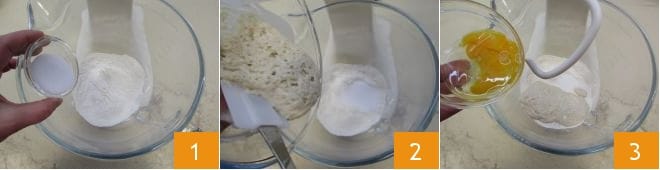 Now you can proceed to make the second dough: pour 150 g of the flour mixture and 20 g of sugar into the bowl of a stand mixer with a dough hook 1, add the starter 2, and include the egg, lightly beaten and always at room temperature 3.