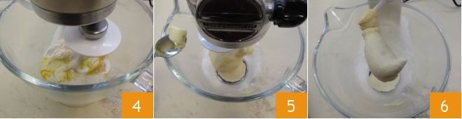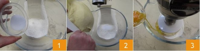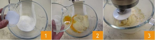 Now take care of the 4th and final dough: pour 200 g of the flour mixture into the bowl of the stand mixer, add 40 g of sugar 1, the third dough, the previously beaten egg 2, and work everything for a few minutes 3.