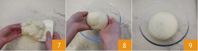 At this point, transfer the dough to a work surface using a dough scraper 7, shape it into a ball, and place it in a bowl 8, cover with plastic wrap, and let it rise again in the oven turned off with the light on for 4 hours until it has doubled in volume 9.
