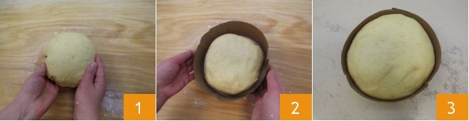 At this point, transfer the dough to a lightly floured work surface, give it folds again, and shape the dough into a sphere 1. Place it inside a 1.65 lbs cardboard panettone mold 2 and leave it in the oven turned off with the light on for about 2 hours, until the dough almost reaches the edge. Leave it at room temperature for a few minutes to slightly dry the outer part