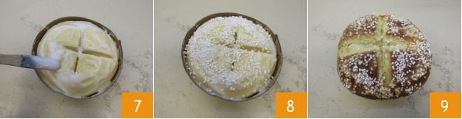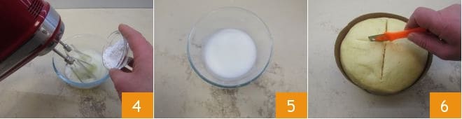 and in the meantime prepare the glaze by slightly beating the egg whites with the powdered sugar 4 until you get a frothy but not firm mixture 5. Using a sharp knife, cut a cross on the surface of the focaccia 6