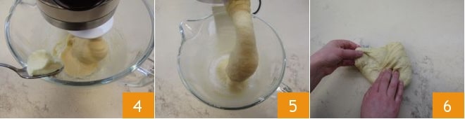 Wait 2-3 minutes and gradually add 30 g of soft butter 4, and continue to work the dough until it is well combined 5. At this point, transfer it to a work surface, and using your hands, give the dough some folds, pulling the outer edges of the dough towards the center 6, this will give it more strength.