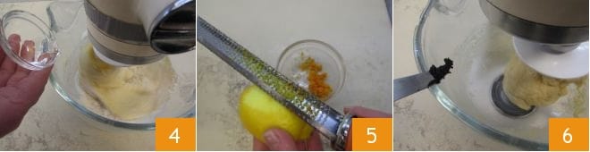 Then add the rum 4, let it be absorbed, and in the meantime grate the zest of an orange and a lemon 5. Then add the salt and the seeds from a vanilla pod to the stand mixer 6