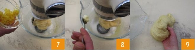 and the citrus zests 7. Lastly, gradually add 40 g of softened butter 8 and wait until the dough is well combined. Transfer it to a work surface