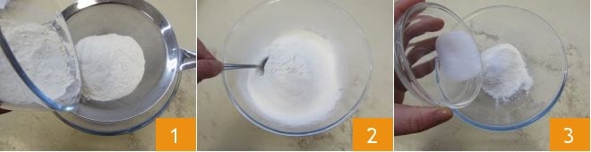 To prepare the Venetian focaccia, start by sifting together 250 g of all-purpose flour and 250 g of manitoba flour 1, to obtain a flour with the right strength; this amount will be sufficient for all subsequent doughs. Moreover, it is important that all ingredients are at a similar temperature to proceed with the preparation of the Venetian focaccia. Once you've obtained your flour mixture, stir it with a spoon 2 and set aside 50 g, then place it in another bowl and add 20 g of sugar 3.