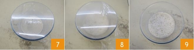 At this point, cover with plastic wrap 7 and let rise in the oven turned off with the light on for 1 hour or until it has doubled in volume 8 and bubbles have formed on the surface 9.