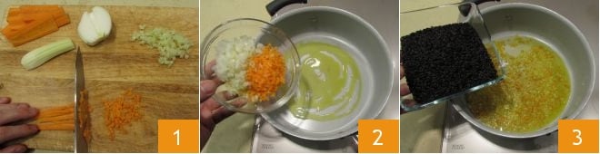 To make the Venus rice with curry, prepare a quart of Vegetable broth, then wash, peel, and chop celery, carrot, and onion for the sauté 1. Heat the olive oil in a large saucepan, add the chopped vegetables for the sauté 2, let them soften for 5 minutes, and then add the Venus rice 3.