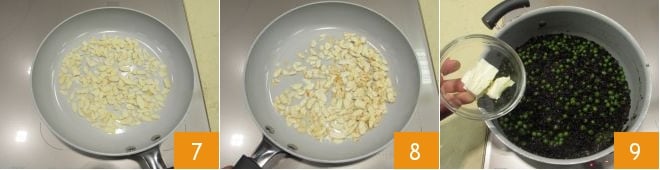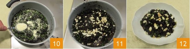 In the meantime, place the almonds in a pan 7 and toast them for a few minutes 8. Once cooking is finished, turn off the heat and stir the rice with the butter 9,