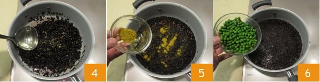 Toast the rice for a few moments and then add the hot vegetable broth, one ladle at a time 4, waiting for the liquid to be absorbed before adding more. Cook for 10 minutes, then add the curry 5, immediately add more broth, and stir to season the rice. Then add the peas 6 and cook for another 10-15 minutes, continuously adding broth a little at a time until the rice is cooked. Adjust salt and pepper to taste if necessary.