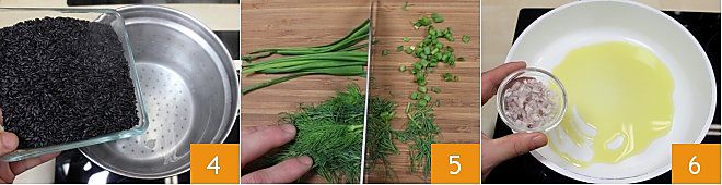 Cook the Venus rice in plenty of boiling salted water and let it cook for at least 20 minutes, or according to the instructions on the rice package 4. Finely chop the dill, chives 5, and shallot. Sauté the shallot with extra virgin olive oil in a large pan over low heat for a few minutes 6.