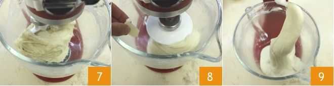 add the granulated sugar 4. Start kneading using the paddle attachment and slowly add the milk with the yeast 5, turn on the stand mixer to combine the mixture, then add the milk in which you dissolved the salt 6.