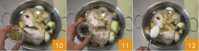 the coriander seeds 10, the whole peppercorns 11, and the coarse salt 12. Mix well and let it cook on low heat for 5 hours.