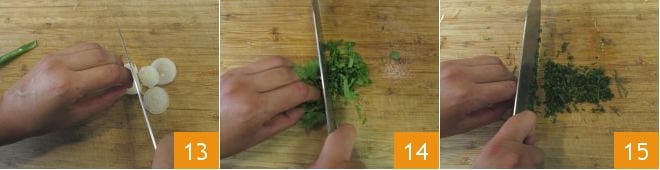 Towards the end of the broth cooking time, you can prepare the other ingredients: clean both the onions and the scallion and slice them thinly 13, chop the coriander 14 and chives 15 with a knife.