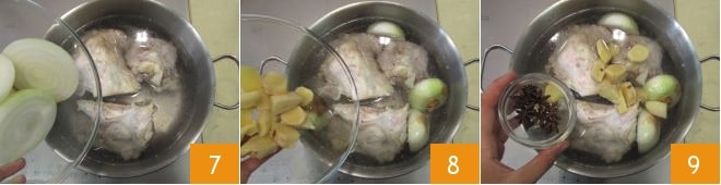 Add the halved onions 7, the ginger 8, the star anise 9,