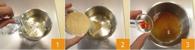 To make the Vietnamese rolls, start by preparing the accompanying sweet and sour sauce. In a saucepan, pour the rice vinegar, water 1, brown sugar 2, and coarsely chopped chili pepper 3.